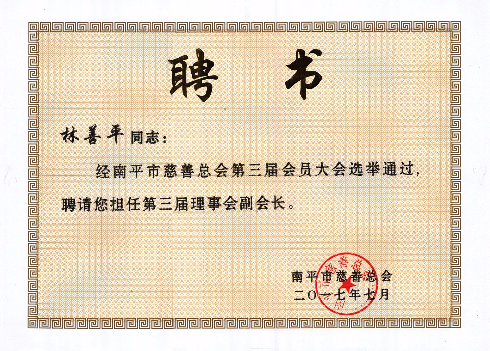 2017年7月28日,南平市慈善捐贈大會暨市慈善總會換屆會議在南平市委舉行,福建順昌虹潤董事長林善平再次當(dāng)選為南平市慈善總會第三屆理事會副會長,這也是林善平董事長第三次當(dāng)選此職。同時,在本次慈善捐贈大會上,他再次向市慈善總會捐款50萬元。他表示,他還將一如既往,繼續(xù)加大對社會公益事業(yè)的支持力度,積極投身公益和慈善事業(yè),為南平市的慈善事業(yè)作出更大的貢獻(xiàn)。目前,林善平董事長各項公益捐款累計已達(dá)1000余萬元。