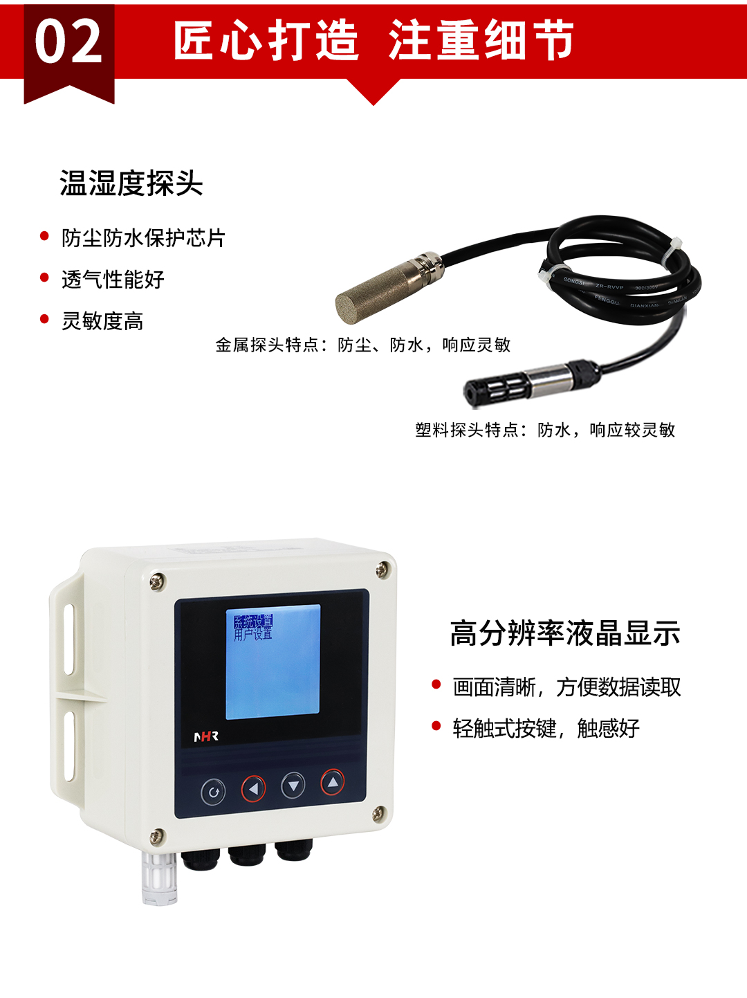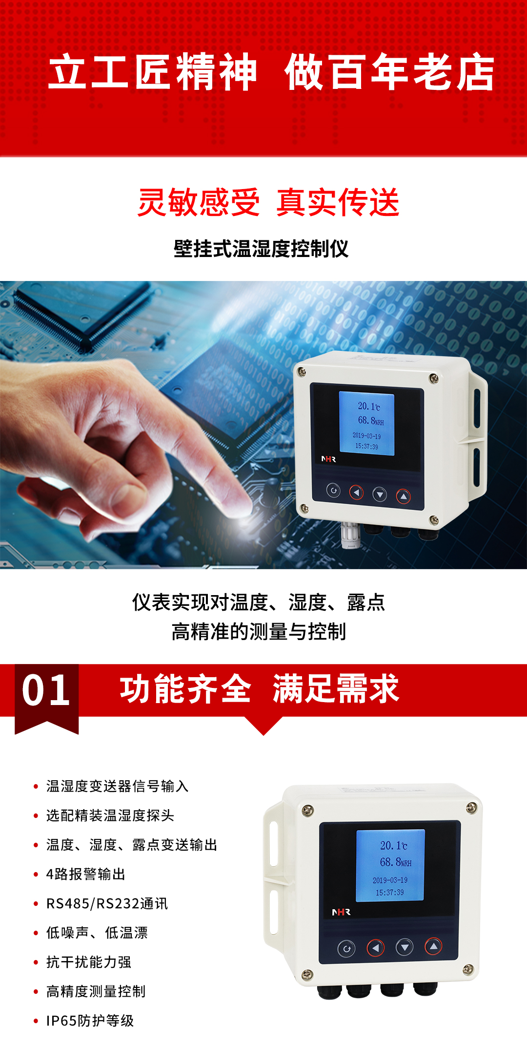 虹潤公司是專業(yè)生產(chǎn)環(huán)境監(jiān)測儀表的國家專精特新“小巨人”企業(yè)。生產(chǎn)的壁掛式溫濕度控制器,具有溫度、濕度、露點高精準的測量,多種輸出類型,穩(wěn)定性強,RS485/RS232通訊,IP65防護等級等特點。產(chǎn)品獲得一種手持式低功耗溫濕度檢測儀、大屏幕溫濕度記錄儀等2項國家發(fā)明專利,主持起草物聯(lián)網(wǎng)智能溫度儀表通用技術(shù)條件、冷鏈溫度記錄儀等2項國家標準,通信系統(tǒng)多通道數(shù)據(jù)采集控制終端規(guī)范軍用標準,以及現(xiàn)場設(shè)備集成等5項智能制造國家標準,參與國際5G標準制定,取得溫濕度儀表等2項相關(guān)軟件著作權(quán)。產(chǎn)品廣泛應(yīng)用于工業(yè)現(xiàn)場、農(nóng)業(yè)大棚、倉儲物流、地下管廊、養(yǎng)殖孵化、配電機房等諸多領(lǐng)域。