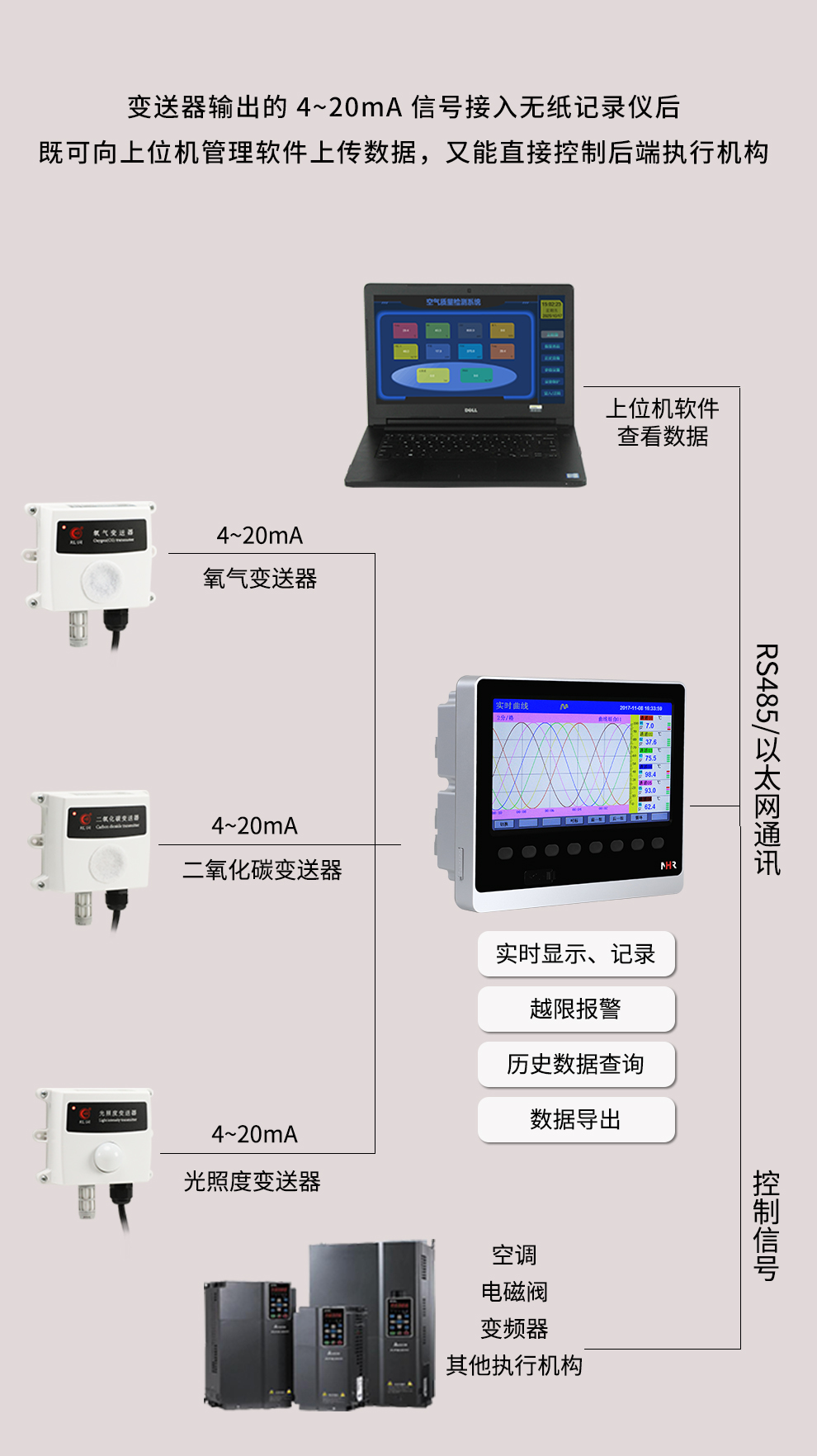 虹潤公司是專業(yè)生產(chǎn)環(huán)境監(jiān)測儀表的國家專精特新“小巨人”企業(yè)。生產(chǎn)的二氧化碳變送器,具有新型紅外檢定技術(shù),自動溫度補償,響應(yīng)靈敏,低功耗,模擬量變送輸出或RS485通訊等特點。產(chǎn)品獲得一種農(nóng)業(yè)監(jiān)控變送器、一種儀表電源等2項實用新型專利,主持起草現(xiàn)場設(shè)備集成等5項智能制造國家標準,以及現(xiàn)場設(shè)備工具(FDT)接口規(guī)范、物聯(lián)網(wǎng)總體技術(shù)智能傳感器特性與分類等2項國家標準,參與國際5G標準制定,取得農(nóng)業(yè)監(jiān)測變送器等3項相關(guān)軟件著作權(quán)。產(chǎn)品廣泛應(yīng)用于機房、配電站、地下車庫、工廠倉庫、食品儲存、養(yǎng)殖場、果蔬林園等環(huán)境場合對二氧化碳濃度的檢測。