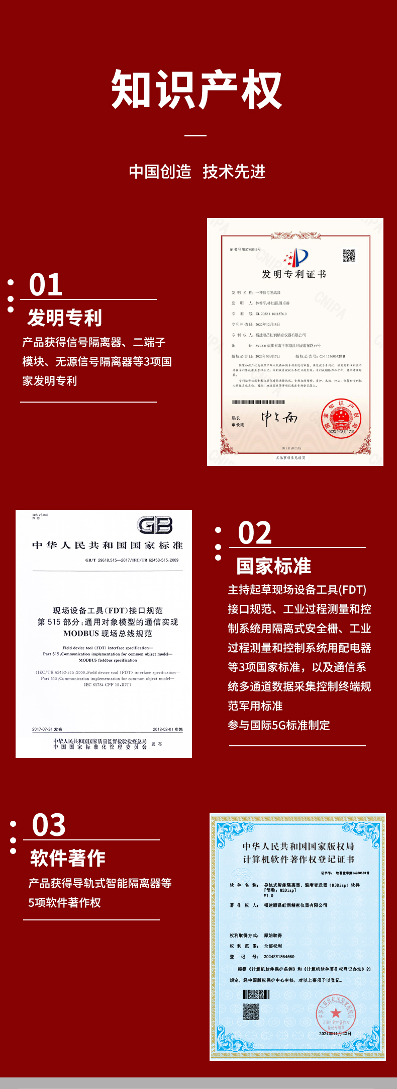 虹潤公司是專業(yè)生產(chǎn)隔離器的國家專精特新“小巨人”企業(yè)。生產(chǎn)的智能信號隔離器涵蓋電流電壓變送器、溫度變送器、配電器、頻率轉(zhuǎn)換器、開關(guān)量轉(zhuǎn)換器及通訊轉(zhuǎn)換器等多種產(chǎn)品類型。產(chǎn)品獲得信號隔離器、一種二端子模塊、無源信號隔離器等3項國家發(fā)明專利,主持起草現(xiàn)場設備工具(FDT)接口規(guī)范、工業(yè)過程測量和控制系統(tǒng)用隔離式安全柵、工業(yè)過程測量和控制系統(tǒng)用配電器等3項國家標準,以及通信系統(tǒng)多通道數(shù)據(jù)采集控制終端規(guī)范軍用標準,參與國際5G標準制定,取得導軌式智能隔離器、頻率轉(zhuǎn)換器等3項相關(guān)軟件著作權(quán)。產(chǎn)品廣泛電力、冶金、工業(yè)電爐、變電站、高壓電機房等需要電隔離的工業(yè)自動化控制系統(tǒng)。