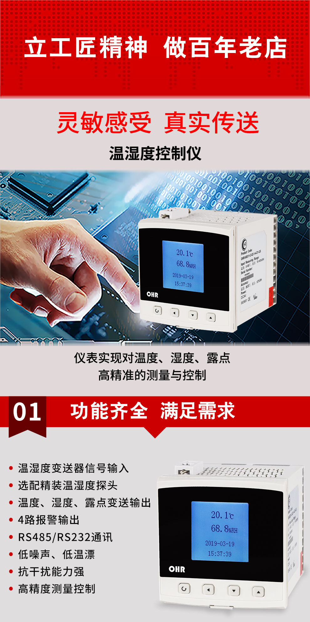 虹潤公司是專業(yè)生產(chǎn)環(huán)境監(jiān)測儀表的國家專精特新“小巨人”企業(yè)。生產(chǎn)的盤裝式溫濕度控制器,具有溫度、濕度、露點(diǎn)高精準(zhǔn)的測量,壁掛式結(jié)構(gòu),IP65防護(hù)穩(wěn)定性強(qiáng),高抗干擾,帶RS485/RS232通訊輸出等級等特點(diǎn)。產(chǎn)品獲得一種手持式低功耗溫濕度檢測儀、大屏幕溫濕度記錄儀等2項國家發(fā)明專利,主持起草物聯(lián)網(wǎng)智能溫度儀表通用技術(shù)條件、冷鏈溫度記錄儀等2項國家標(biāo)準(zhǔn),通信系統(tǒng)多通道數(shù)據(jù)采集控制終端規(guī)范軍用標(biāo)準(zhǔn),以及現(xiàn)場設(shè)備集成等5項智能制造國家標(biāo)準(zhǔn),參與國際5G標(biāo)準(zhǔn)制定,取得溫濕度儀表等2項相關(guān)軟件著作權(quán)。產(chǎn)品廣泛應(yīng)用于工業(yè)現(xiàn)場、農(nóng)業(yè)大棚、倉儲物流、地下管廊、養(yǎng)殖孵化、配電機(jī)房等諸多領(lǐng)域。