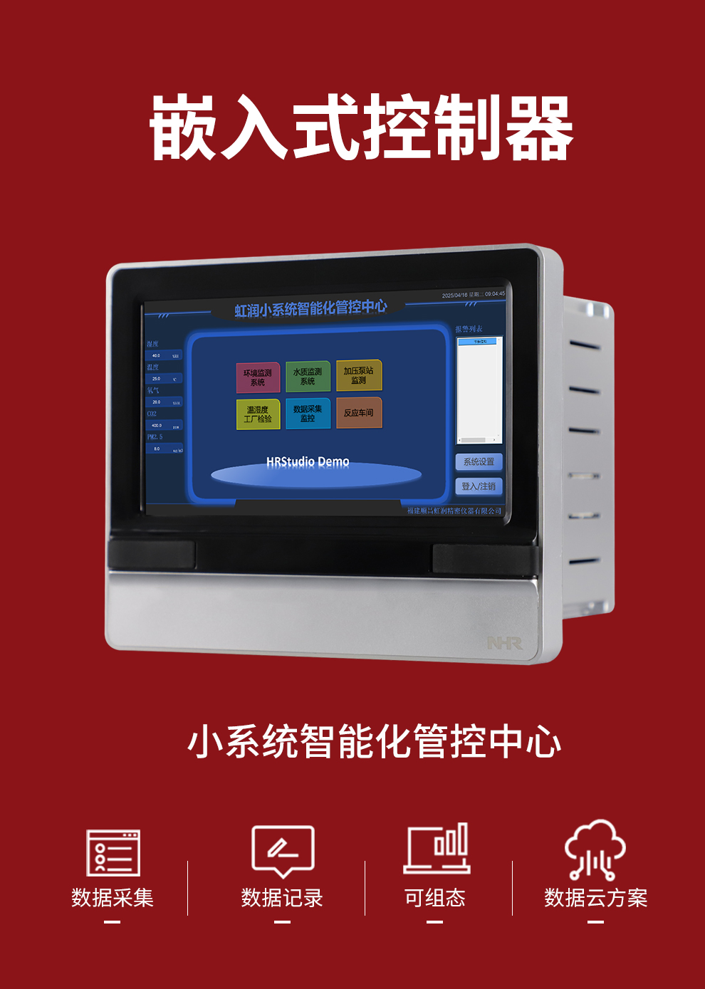 虹潤公司是專業(yè)生產(chǎn)觸摸屏的國家專精特新“小巨人”企業(yè)。生產(chǎn)的嵌入式控制器,具有數(shù)據(jù)采集與記錄,內(nèi)置與外配組態(tài)軟件,數(shù)據(jù)云方案,RS485/以太網(wǎng)通訊等特點。產(chǎn)品獲得嵌入式數(shù)據(jù)采集工作站組網(wǎng)系統(tǒng)、數(shù)據(jù)采集工作站、無紙記錄儀、智能化控制器、巡回檢測顯示方法及裝置等5項國家發(fā)明專利;主持起草通信系統(tǒng)多通道數(shù)據(jù)采集控制終端規(guī)范軍用標準,物聯(lián)網(wǎng)智能記錄儀表通用技術(shù)條件國家標準,以及空間數(shù)據(jù)與信息數(shù)據(jù)傳輸系統(tǒng)等2項航天標準,參與國際5G標準制定;取得嵌入式數(shù)據(jù)采集控制工作站以及HRStudio畫面組態(tài)軟件等4項相關(guān)軟件著作權(quán)。產(chǎn)品廣泛應用于航天航空、化工、冶金、制藥、設(shè)備配套、現(xiàn)代農(nóng)業(yè)、環(huán)境監(jiān)測等諸多領(lǐng)域。