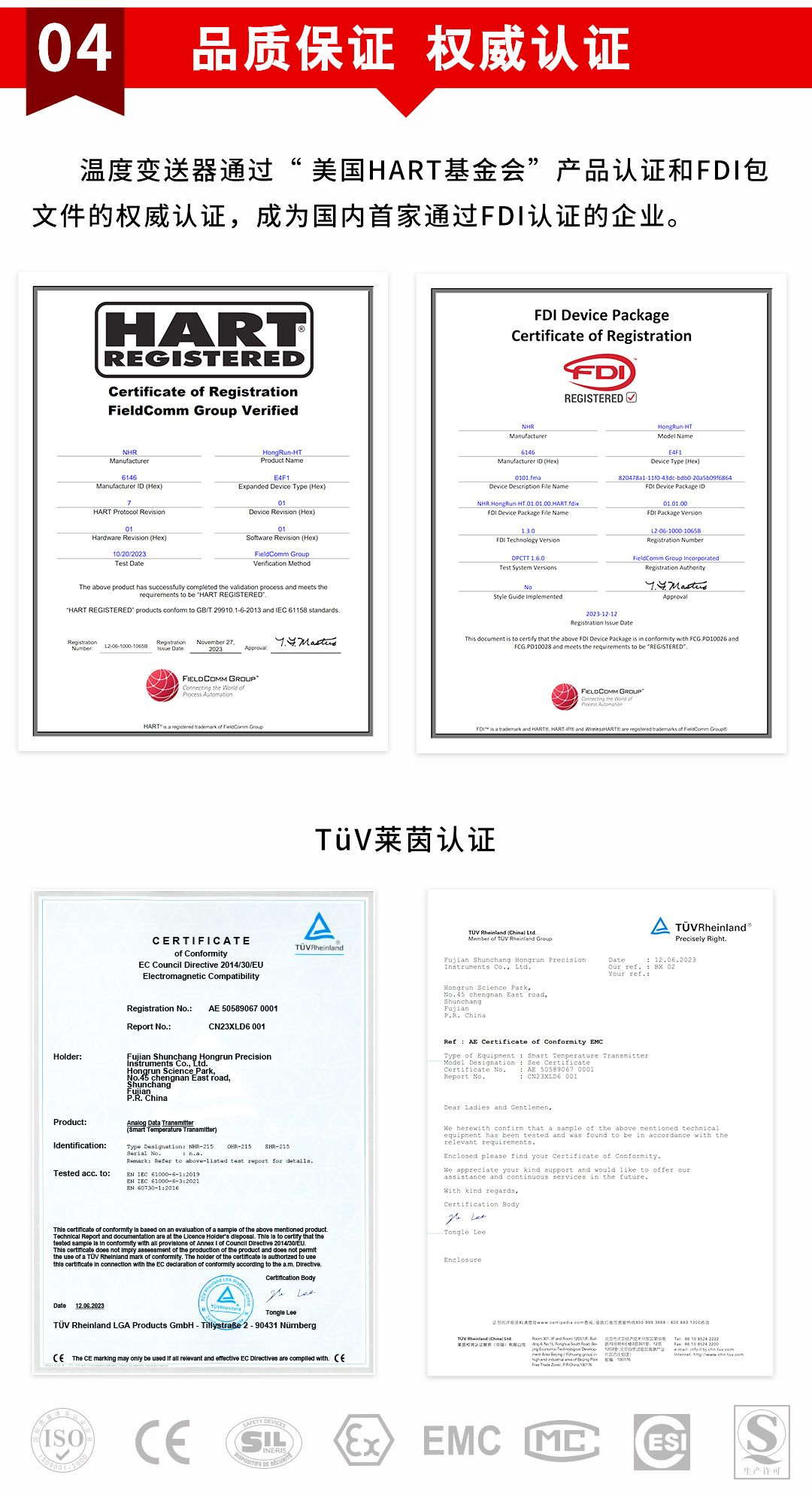 虹潤公司是專業(yè)生產(chǎn)溫度變送器的國家專精特新“小巨人”企業(yè)。生產(chǎn)的智能溫度變送器,具有適配各類溫度傳感器,精度高,通過編程線修改輸入信號類型及量程,高抗干擾,HART或485通訊等特點。該產(chǎn)品不僅通過HART基金會認證、德國萊茵 CE 認證與 SIL 功能安全認證,還獲得具備減震抗干擾能力的溫度變送器、信號隔離器、一種二端子模塊、無源信號隔離器等4項國家發(fā)明專利,主持起草物聯(lián)網(wǎng)智能溫度儀表、現(xiàn)場設備工具(FDT)接口規(guī)范、工業(yè)過程測量和控制系統(tǒng)用溫度變送器等3項國家標準,以及通信系統(tǒng)多通道數(shù)據(jù)采集控制終端規(guī)范軍用標準,參與國際5G標準制定,取得HART溫度變送器、智能溫度變送器等3項相關軟件著作權。產(chǎn)品廣泛應用于石油、化工、電力、冶金、制藥、食品、水處理等各種工業(yè)領域。