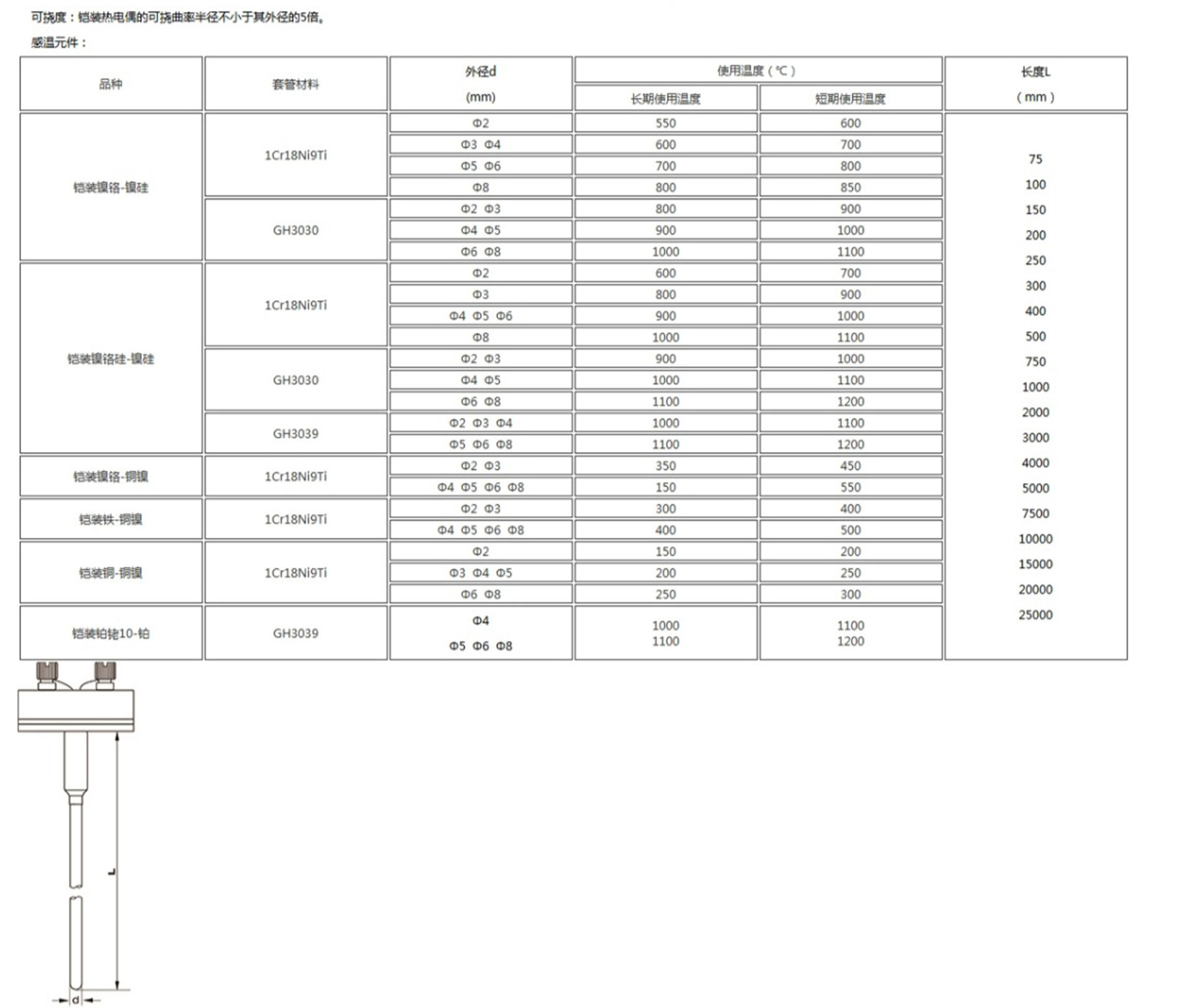 鎧裝熱電偶作為溫度測(cè)量傳感器,通常與溫度變送器、調(diào)節(jié)器及顯示儀表等配套使用,組成過(guò)程控制系統(tǒng),用以直接測(cè)量或控制各種生產(chǎn)過(guò)程中0-1800℃范圍內(nèi)的流體、蒸汽和氣體介質(zhì)以及固體表面等溫度。鎧狀熱電偶具有能彎曲、耐高壓、熱響應(yīng)時(shí)間快和堅(jiān)固耐用等許多優(yōu)點(diǎn)。