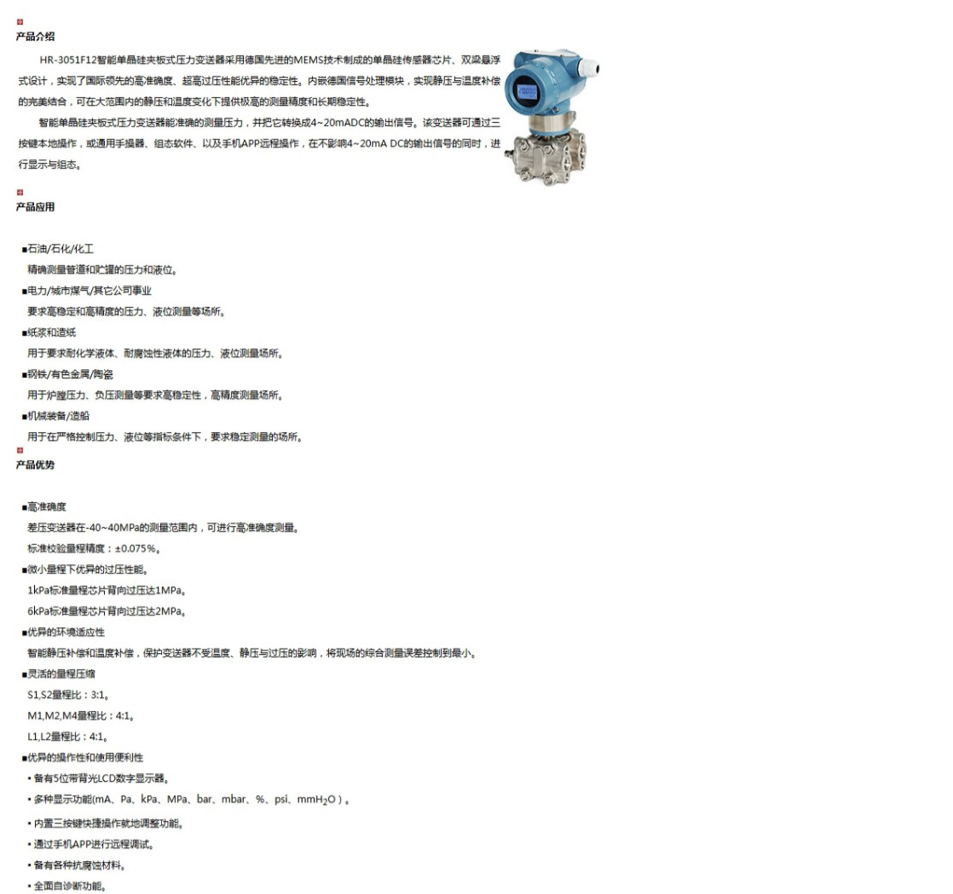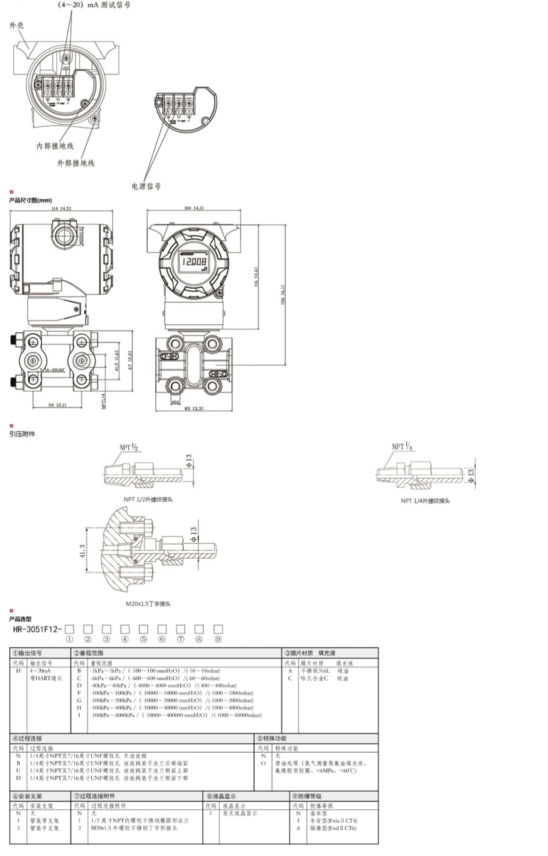 HR-3051F12智能單晶硅夾板式壓力變送器能準(zhǔn)確的測(cè)量壓力,并把它轉(zhuǎn)換成4~20mADC的輸出信號(hào)。該變送器可通過三按鍵本地操作,或通用手操器、組態(tài)軟件、以及手機(jī)APP遠(yuǎn)程操作,在不影響4~20mA DC的輸出信號(hào)的同時(shí),進(jìn)行顯示與組態(tài)。