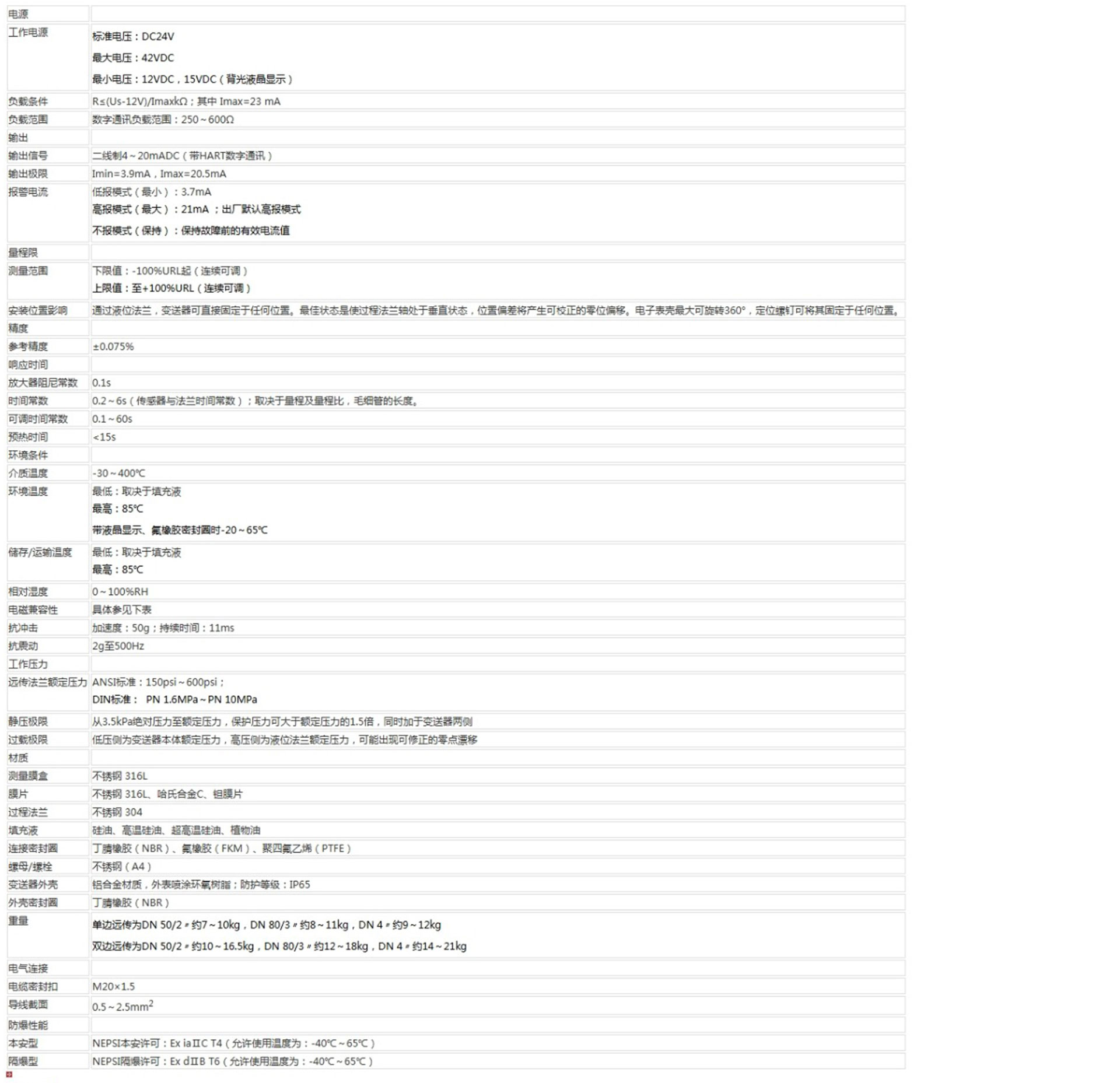 該產(chǎn)品用于測(cè)量液體、氣體或蒸汽的液位、密度、壓力,將其轉(zhuǎn)變成4~20mA (HART)電流輸出信號(hào),可通過RST375手持終端對(duì)它們進(jìn)行參數(shù)設(shè)定、過程監(jiān)控等。測(cè)量范圍(未遷移時(shí))為0-1kPa~2MPa,液位法蘭的額定壓力分別為:1.6/4MPa、6.4MPa、10MPa、150psi、300psi或600psi。