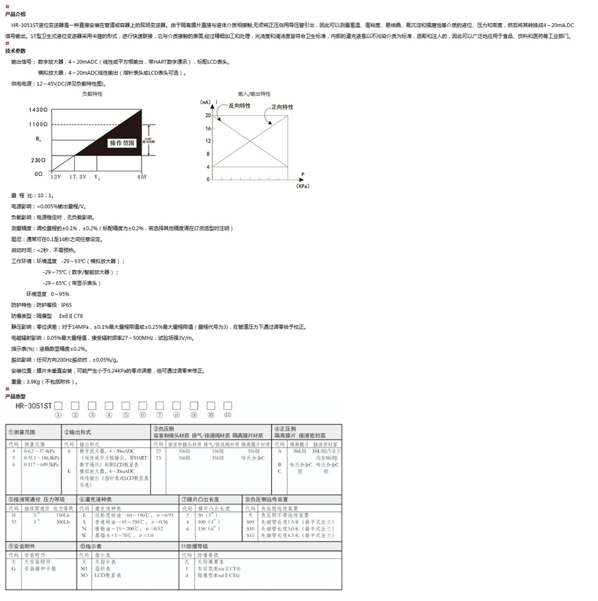 HR-3051ST液位變送器是一種直接安裝在管道或容器上的現場變送器。由于隔離膜片直接與液體介質相接觸,無須將正壓側用導壓管引出,因此可以測量高溫、高粘度、易結晶、易沉淀和強腐蝕等介質的液位、壓力和密度,然后將其轉換成4~20mA.DC信號輸出。